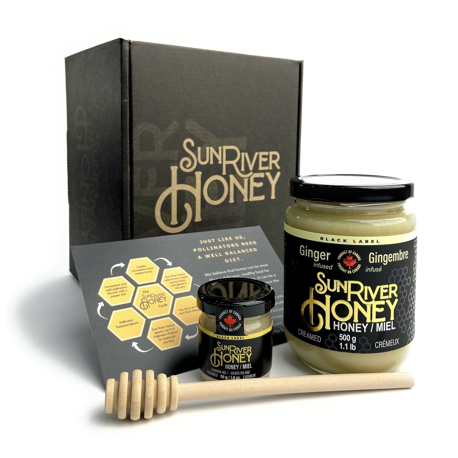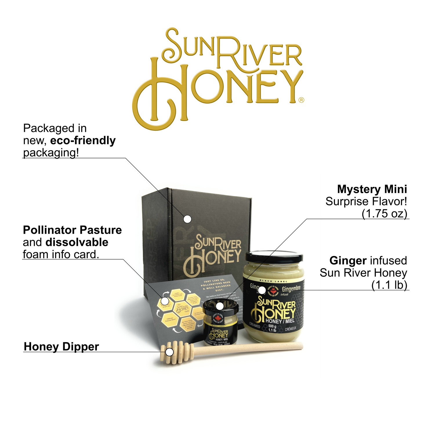 This perfectly curated gift set comes with a 1.1 lb jar of Ginger infused creamed honey, a 1.75 oz surprise MYSTERY FLAVOR, a 4x6 card about our eco-packaging and pollinator pasture program and a cute wooden honey dipper. Each box arrives at your door in our elegant packaging including fully biodegradable foam to keep your honey safe during transit without impacting the environment. Give as a gift or save for yourself and enjoy the tasty experience waiting inside!